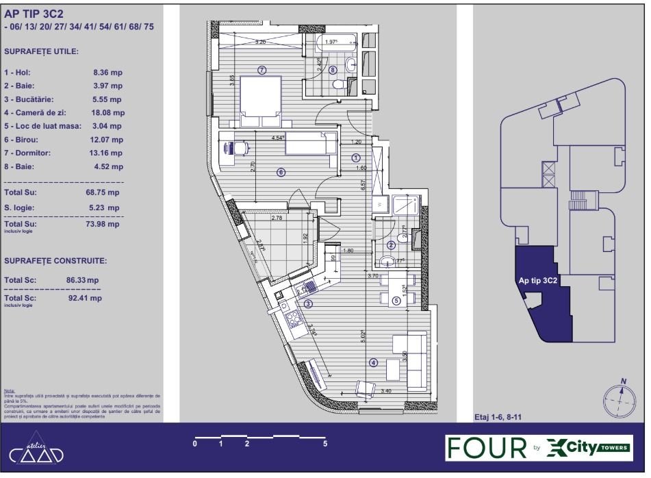 Apartament 3 camere situat în complexul rezidențial XCity Towers din Timișoara.