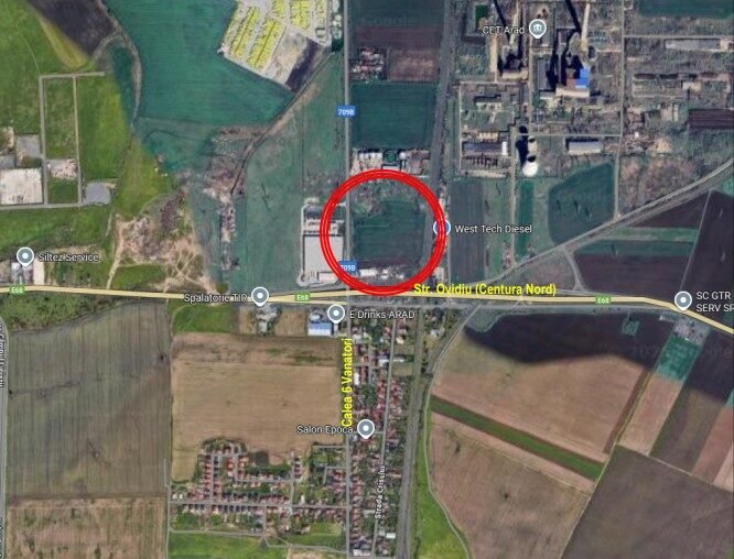 Documentația PUZ servicii,depozitare și comerț Arad analizează un teren situat în extravilanul municipiului, la nord de DN7–E68, cu acces direct din DJ 709B, la km 3+100.